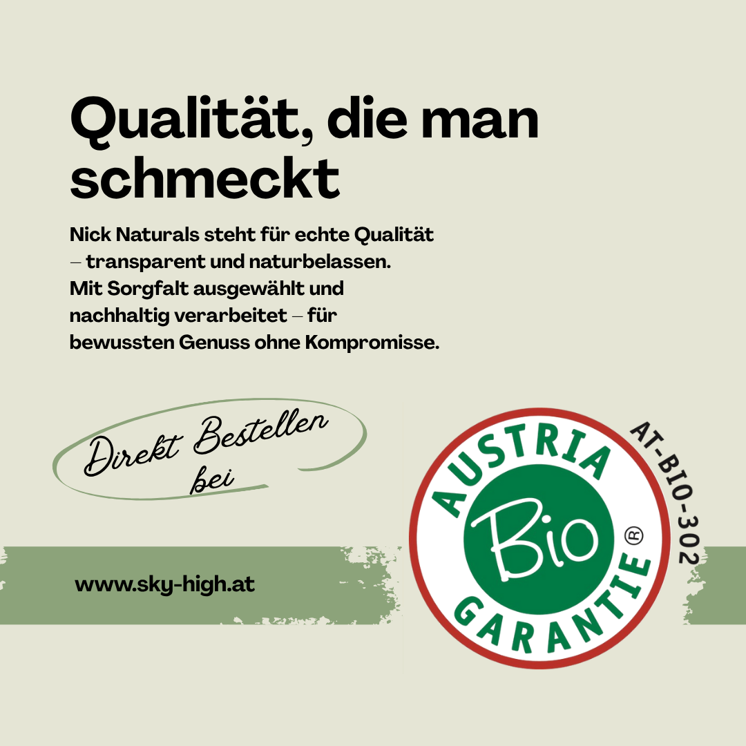 Seit über 10 Jahren steht Nick Naturals für hochwertige Hanflebensmittel aus kontrolliert biologischem Anbau. Unsere Produkte entstehen mit Liebe, Erfahrung und ehrlichem Handwerk – für reinen Genuss direkt aus der Natur.